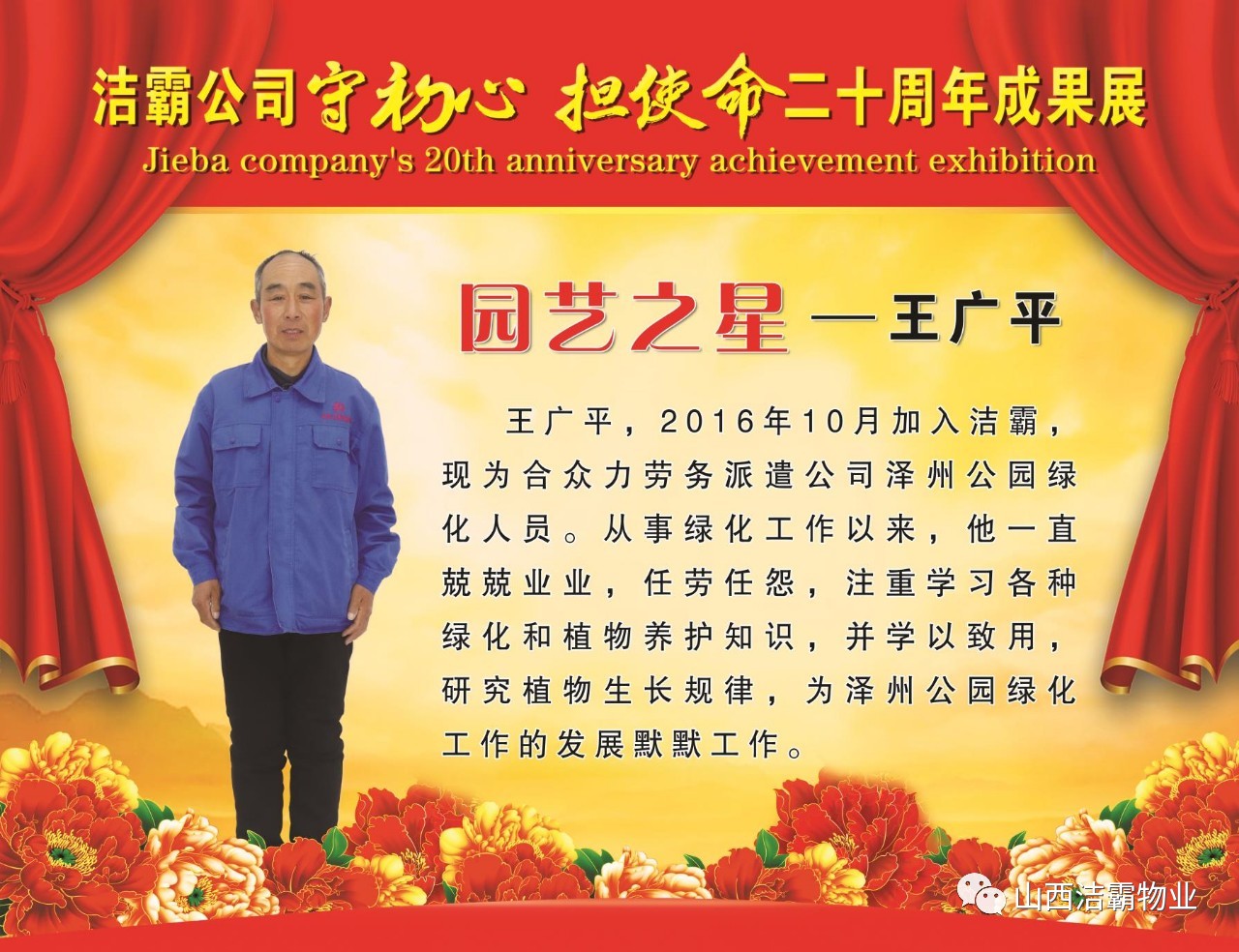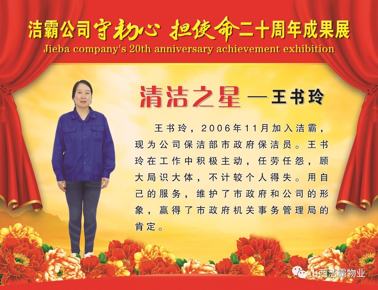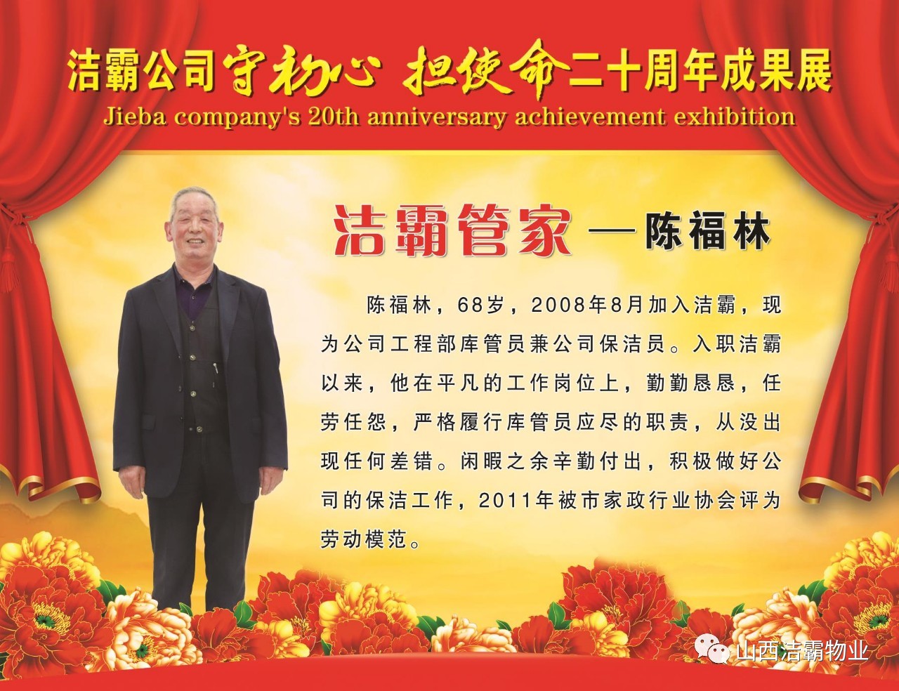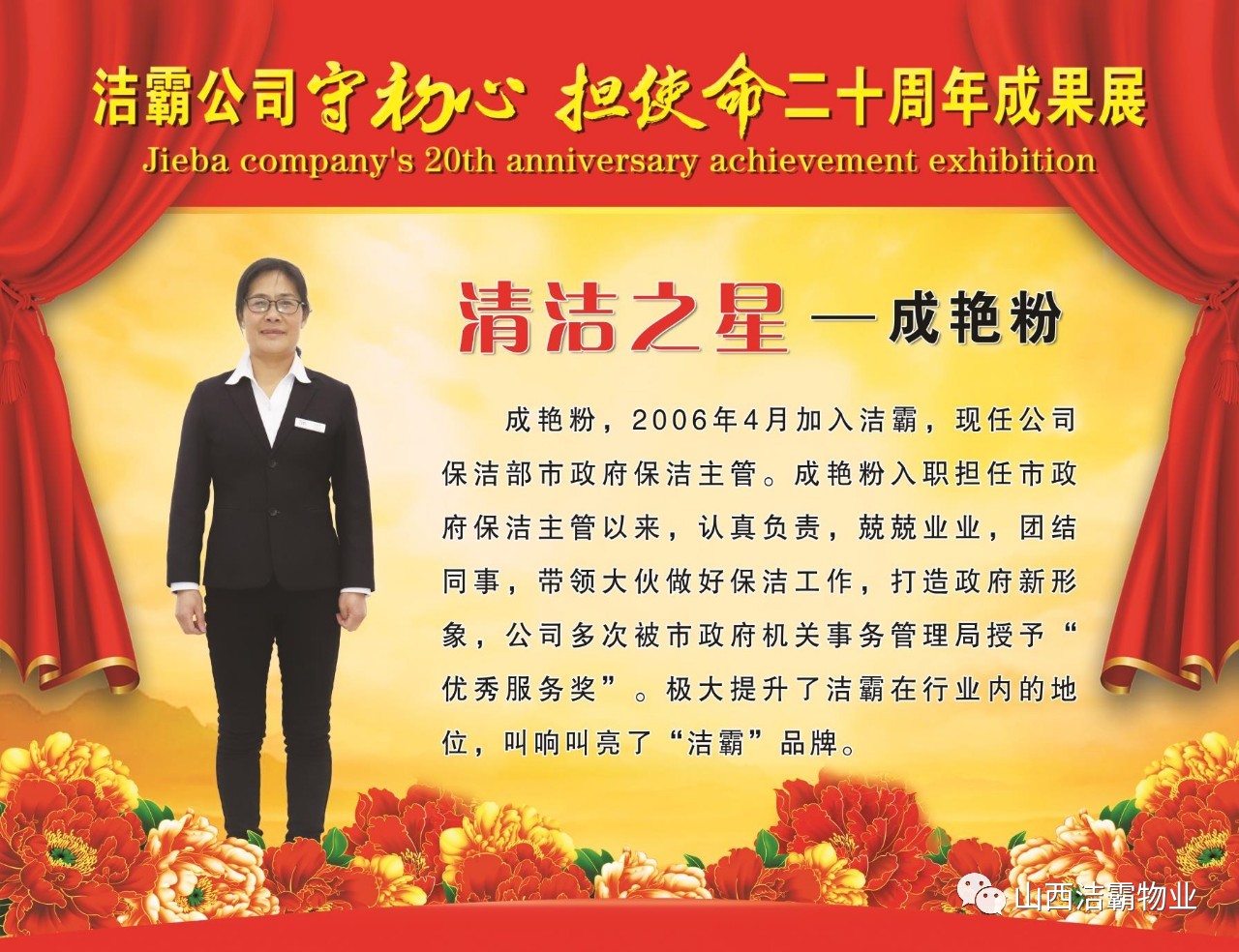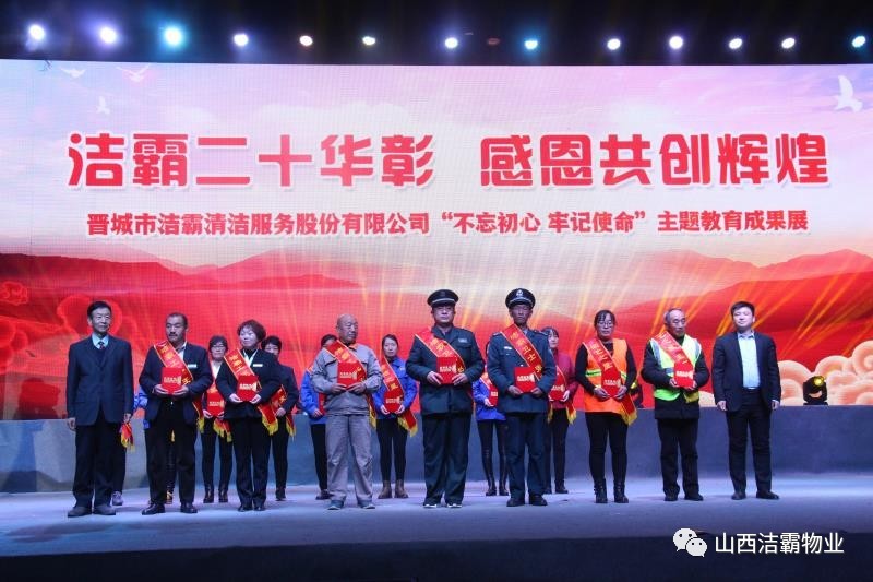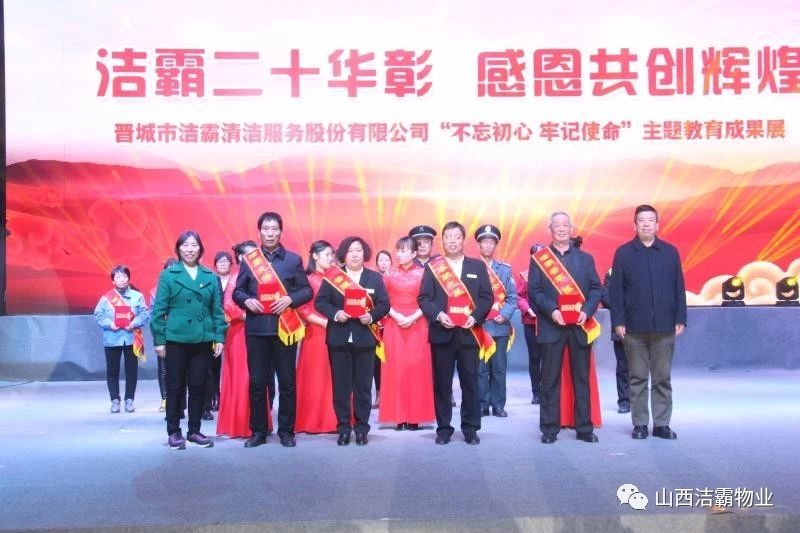 本次晚會以“潔霸二十華彰,感恩共創(chuàng)輝煌”為主題,此次慶典的核心思想是“感恩”,主要角色是潔霸的創(chuàng)業(yè)者。為此,公司對入職潔霸的創(chuàng)業(yè)功勛和一線員工進(jìn)行了表彰獎(jiǎng)勵(lì)。本次晚會共設(shè)8個(gè)獎(jiǎng)項(xiàng),包括“潔霸先鋒”“奉獻(xiàn)之星”“管理之星”“潔霸管家”“潔霸工匠”“清潔之星”“潔霸衛(wèi)士”“園藝之星”等。他們是:李山虎、張永智、史志霞、陳福林、王紅軍、余艷青、劉二丑、成艷粉、楊改梅、王書玲、張國榮、耿竹青、張粉霞、宋秋苗、陳先梅、張晉平、張偉山、趙瑞軍、王廣平、郭志云。晉城市原副市長成育廷、晉城市商務(wù)局原局長王新善、晉城市非公和社會組織工委書記郎軍芳、晉城市婦聯(lián)三級調(diào)研員李蓮菊、晉城市總工會商貿(mào)輕紡煙草服務(wù)業(yè)工會主席張玉濤、晉城市城區(qū)財(cái)政局局長翟明太等領(lǐng)導(dǎo)為他們頒獎(jiǎng)。