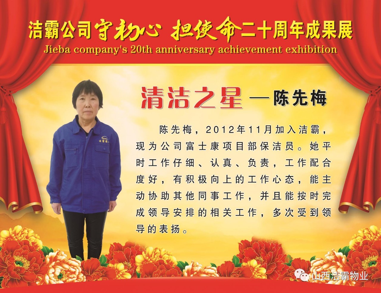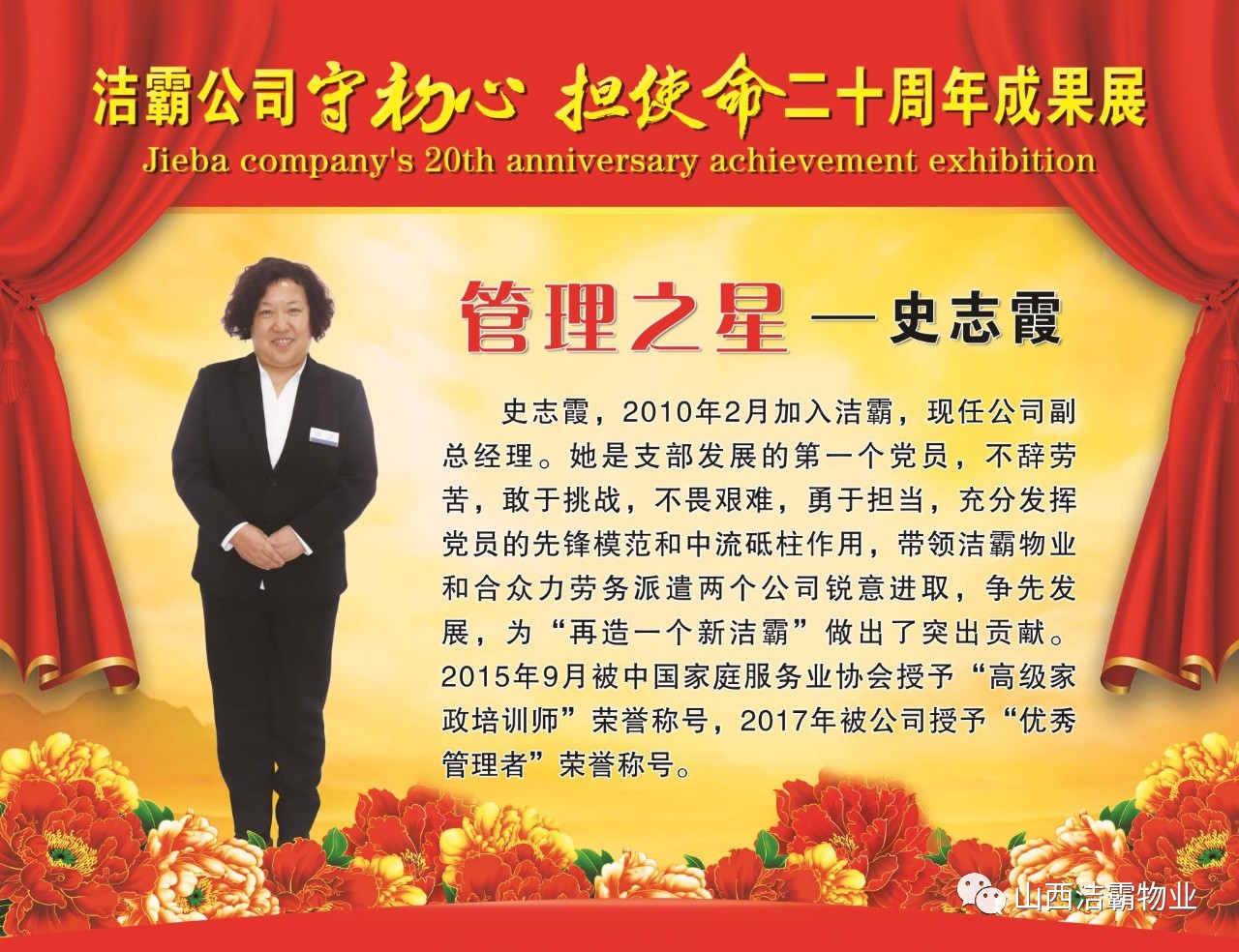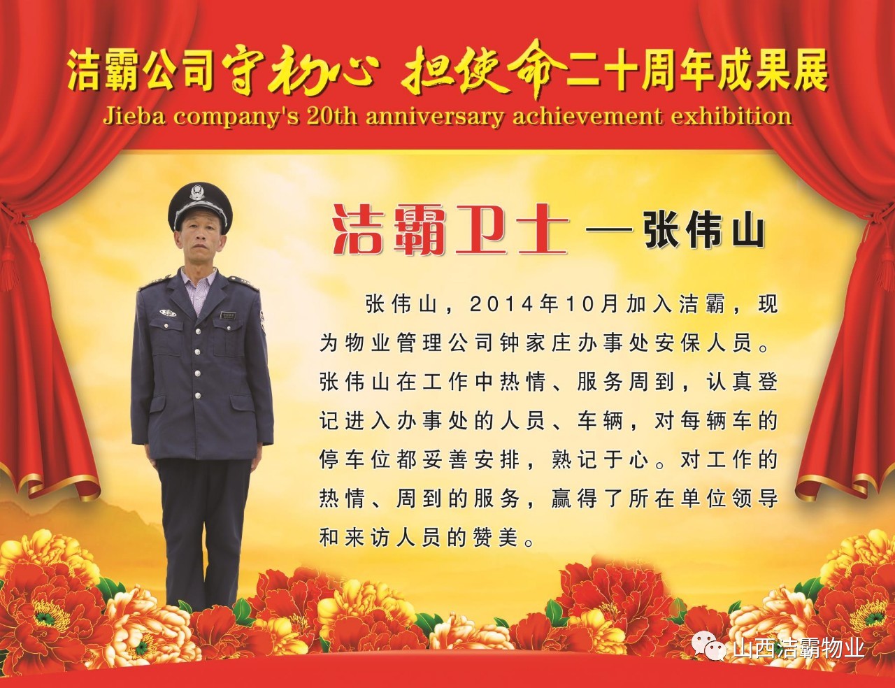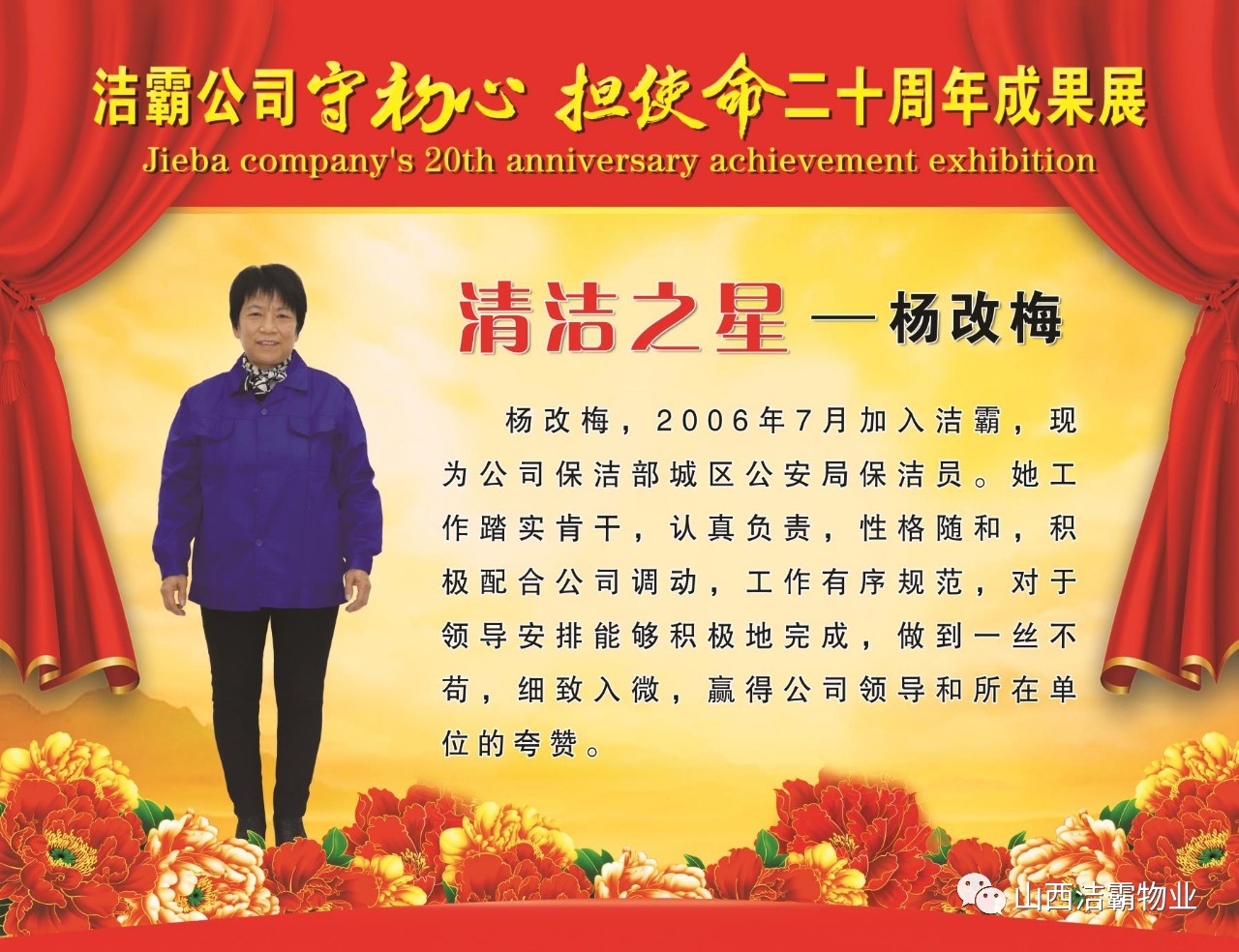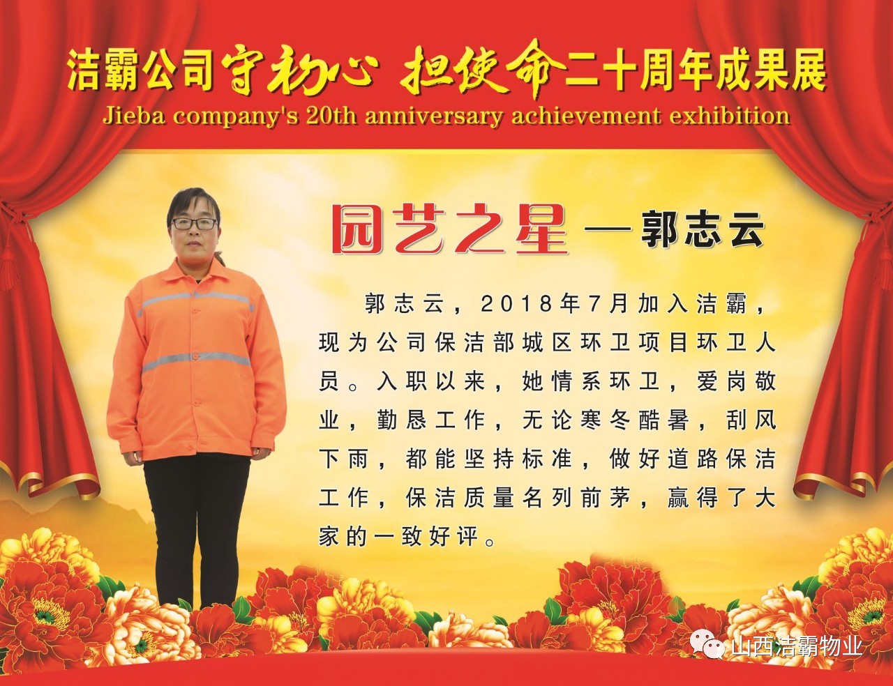 本次晚會以“潔霸二十華彰,感恩共創(chuàng)輝煌”為主題,此次慶典的核心思想是“感恩”,主要角色是潔霸的創(chuàng)業(yè)者。為此,公司對入職潔霸的創(chuàng)業(yè)功勛和一線員工進(jìn)行了表彰獎(jiǎng)勵(lì)。本次晚會共設(shè)8個(gè)獎(jiǎng)項(xiàng),包括“潔霸先鋒”“奉獻(xiàn)之星”“管理之星”“潔霸管家”“潔霸工匠”“清潔之星”“潔霸衛(wèi)士”“園藝之星”等。他們是:李山虎、張永智、史志霞、陳福林、王紅軍、余艷青、劉二丑、成艷粉、楊改梅、王書玲、張國榮、耿竹青、張粉霞、宋秋苗、陳先梅、張晉平、張偉山、趙瑞軍、王廣平、郭志云。晉城市原副市長成育廷、晉城市商務(wù)局原局長王新善、晉城市非公和社會組織工委書記郎軍芳、晉城市婦聯(lián)三級調(diào)研員李蓮菊、晉城市總工會商貿(mào)輕紡煙草服務(wù)業(yè)工會主席張玉濤、晉城市城區(qū)財(cái)政局局長翟明太等領(lǐng)導(dǎo)為他們頒獎(jiǎng)。
