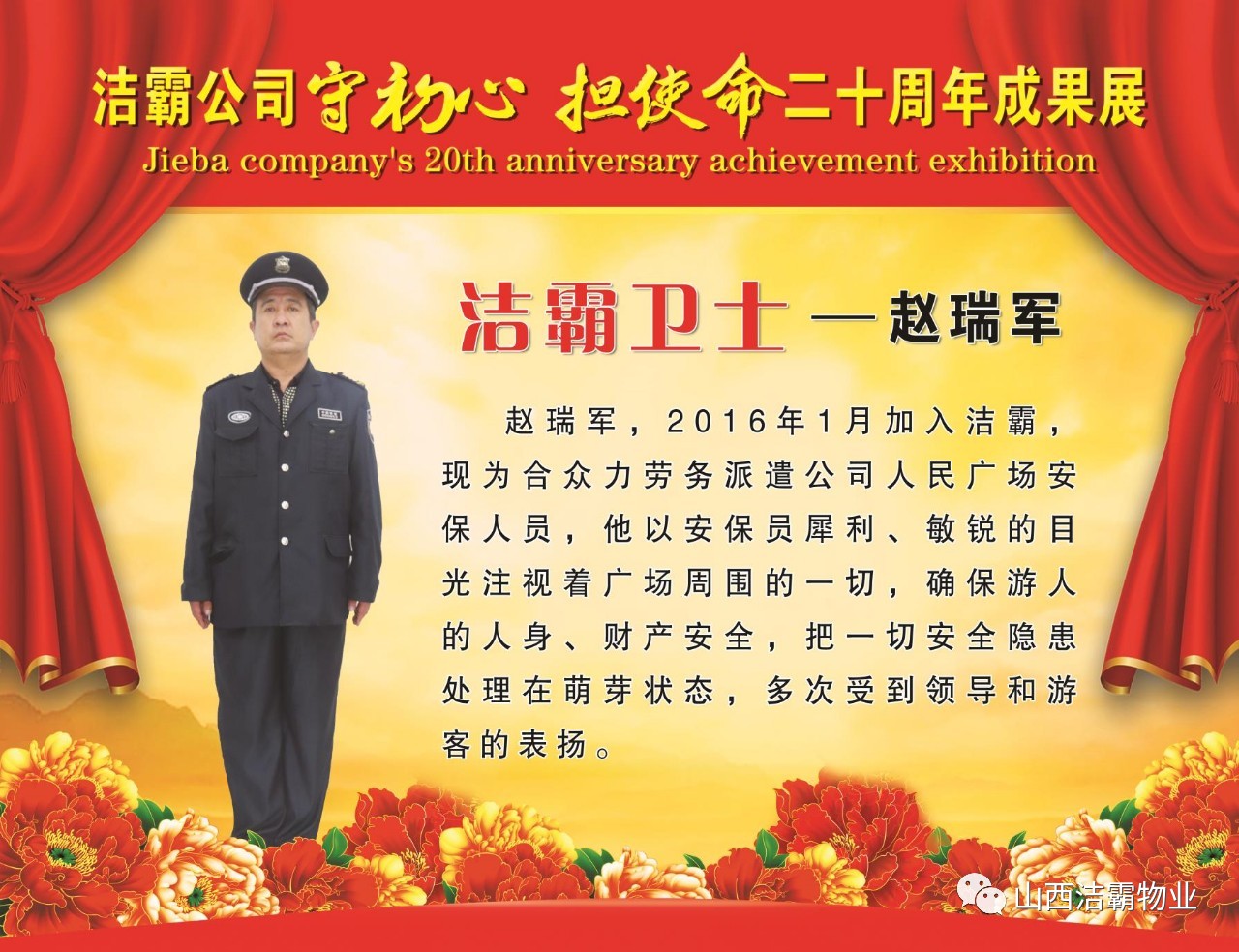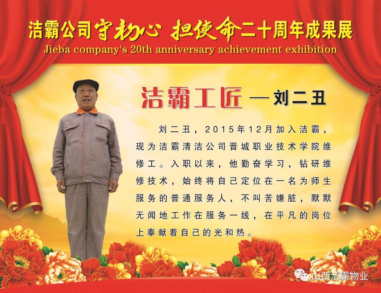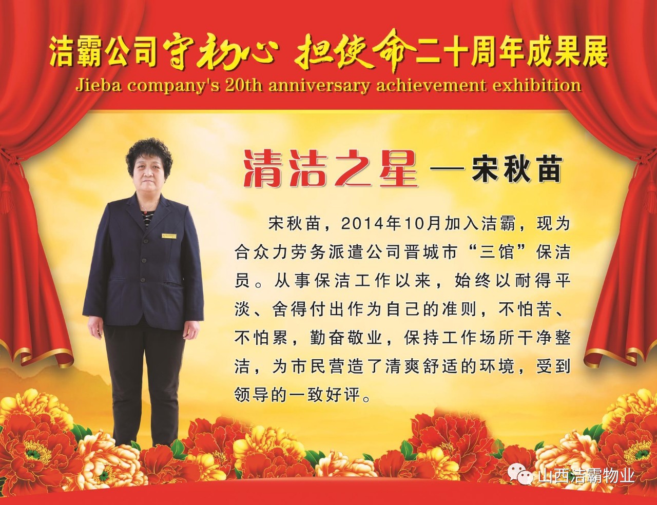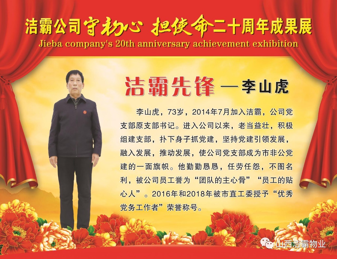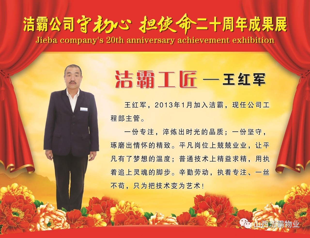 本次晚會以“潔霸二十華彰,感恩共創(chuàng)輝煌”為主題,此次慶典的核心思想是“感恩”,主要角色是潔霸的創(chuàng)業(yè)者。為此,公司對入職潔霸的創(chuàng)業(yè)功勛和一線員工進(jìn)行了表彰獎(jiǎng)勵(lì)。本次晚會共設(shè)8個(gè)獎(jiǎng)項(xiàng),包括“潔霸先鋒”“奉獻(xiàn)之星”“管理之星”“潔霸管家”“潔霸工匠”“清潔之星”“潔霸衛(wèi)士”“園藝之星”等。他們是:李山虎、張永智、史志霞、陳福林、王紅軍、余艷青、劉二丑、成艷粉、楊改梅、王書玲、張國榮、耿竹青、張粉霞、宋秋苗、陳先梅、張晉平、張偉山、趙瑞軍、王廣平、郭志云。晉城市原副市長成育廷、晉城市商務(wù)局原局長王新善、晉城市非公和社會組織工委書記郎軍芳、晉城市婦聯(lián)三級調(diào)研員李蓮菊、晉城市總工會商貿(mào)輕紡煙草服務(wù)業(yè)工會主席張玉濤、晉城市城區(qū)財(cái)政局局長翟明太等領(lǐng)導(dǎo)為他們頒獎(jiǎng)。