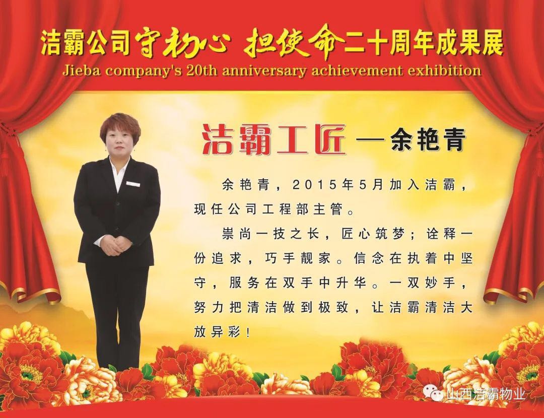 余艷青同志自2015年進(jìn)入潔霸以來,一直奮斗在工程部的第一線從事主管工作。工作中,余艷青同志愛崗敬業(yè),遵守職業(yè)道德,為人誠實守信;她熱愛工作,對待客戶熱情周到、耐心細(xì)致;工作中團(tuán)結(jié)同事,責(zé)任心強(qiáng),吃苦耐勞,服從大局,以公司的利益為重。在我市開展的“三洗六見一紅旗”活動和全國文明城市的創(chuàng)建活動中,她帶領(lǐng)員工高標(biāo)準(zhǔn)、高質(zhì)量、高效率地完成清洗美化工作,為扮靚晉城形象,打造城市優(yōu)美環(huán)境做出了突出貢獻(xiàn)。先后多次被公司評為優(yōu)秀員工等,2019年在公司成立20周年慶之際,她又被公司授予“潔霸工匠”稱號。