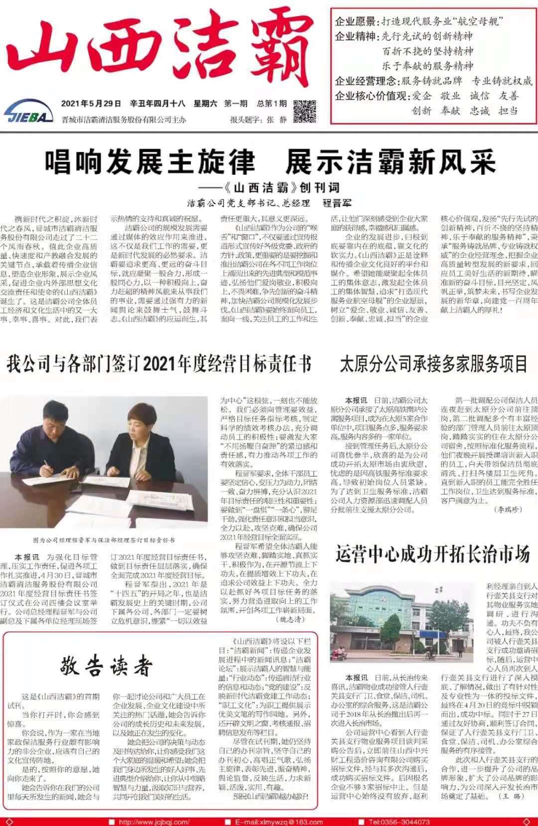 今天是2021年5月29日,經(jīng)過一個多月的緊張籌辦,《山西潔霸》報紙終于創(chuàng)刊啦!這是潔霸人的一件大喜事,也是潔霸人的驕傲!伴隨著《山西潔霸》紙質(zhì)版的內(nèi)部發(fā)行,電子版也同步與你見面了。希望你能通過這個宣傳窗口,更好地走近潔霸,了解潔霸,關(guān)注潔霸,支持潔霸。