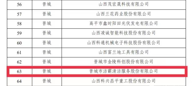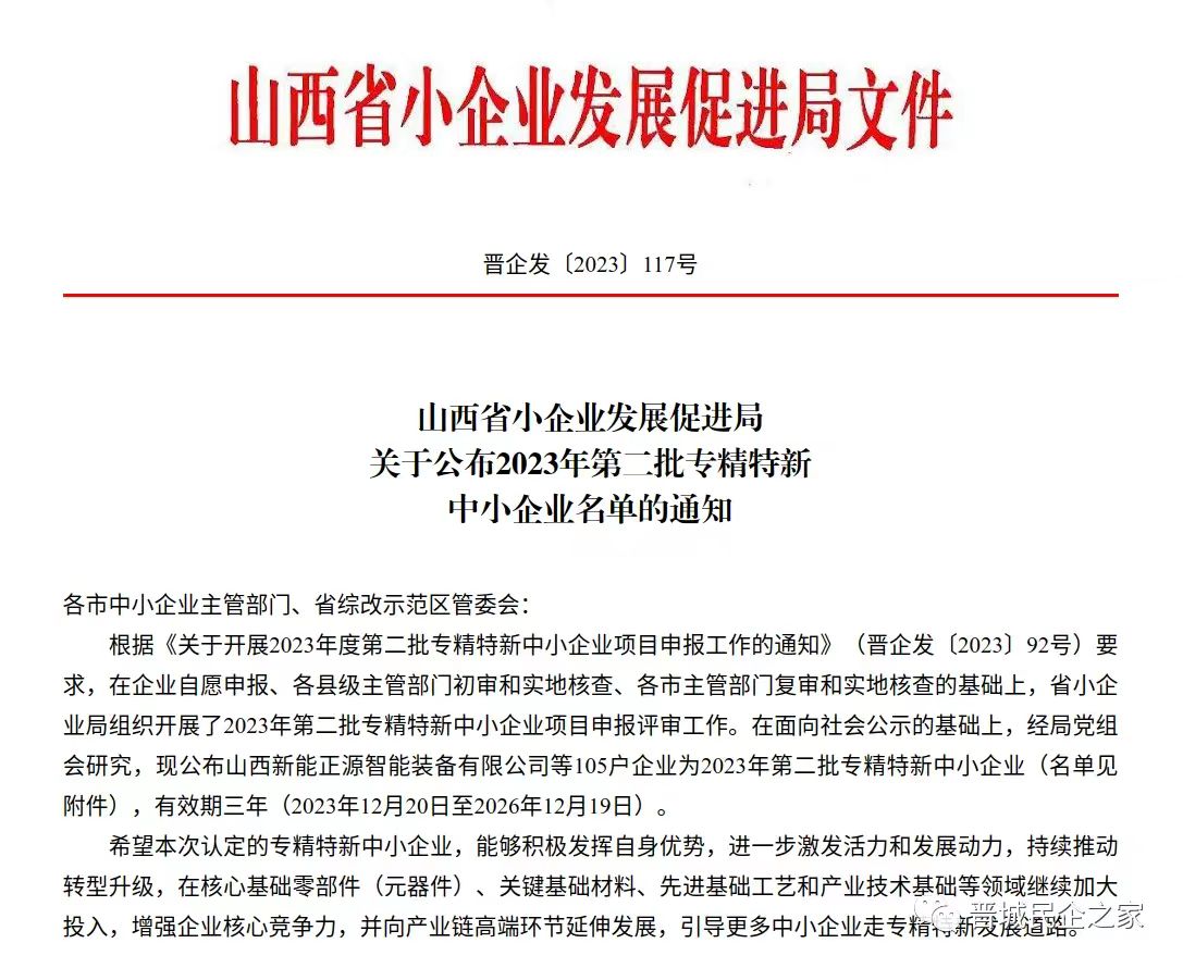 近日,山西省小企業(yè)發(fā)展促進(jìn)局公布了2023年第二批專(zhuān)精特新中小企業(yè)名單(全省共105家,其中晉城市9家),我公司成功上榜。