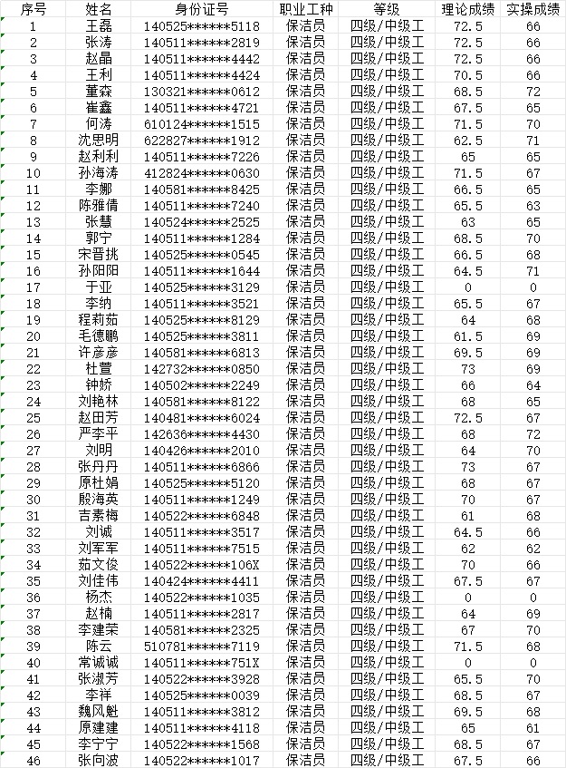 晉城市潔霸清潔服務(wù)股份有限公司職業(yè)技能等級認(rèn)定中心現(xiàn)將2024年1月21日認(rèn)定人員成績公示如下:
