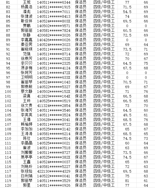 晉城市潔霸清潔服務(wù)股份有限公司職業(yè)技能等級認(rèn)定中心現(xiàn)將2024年2月4日認(rèn)定人員成績公示如下: