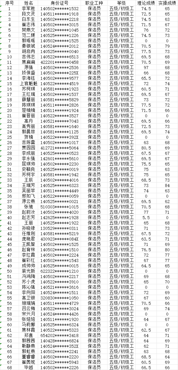晉城市潔霸清潔服務股份有限公司職業(yè)技能等級認定中心現將2024年7月7日認定人員成績公示如下: