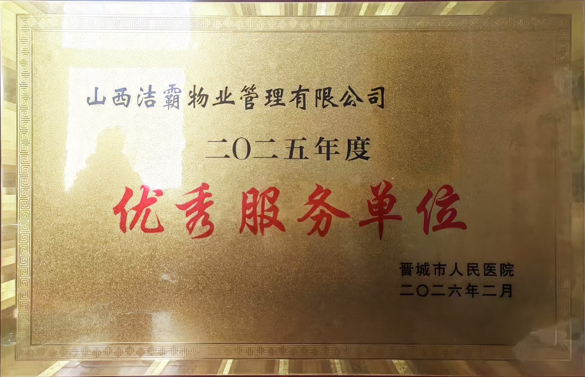 2月8日下午,晉城市人民醫(yī)院隆重召開第三屆職工代表大會第五次會議暨2026年工作會議,全面總結2025年發(fā)展成果,系統(tǒng)部署2026年重點任務,并對為醫(yī)院發(fā)展做出突出貢獻的先進集體與個人進行表彰。山西潔霸物業(yè)管理有限公司憑借優(yōu)質服務表現(xiàn),榮獲晉城市人民醫(yī)院2025年度“優(yōu)秀服務單位”稱號。