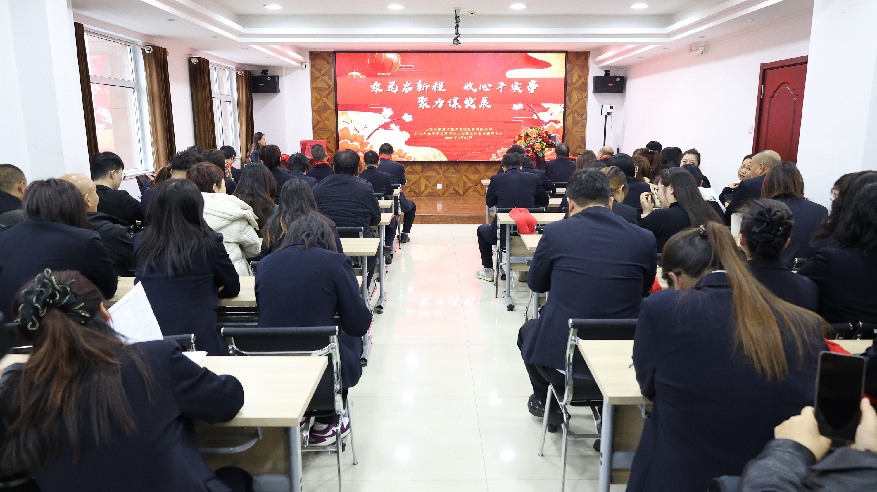 會議召開前,山西潔霸物業(yè)、合眾力勞務派遣、辦公室、保潔部、百潔物業(yè)、潔霸超市、潔霸洗業(yè)、財務部、清洗一部、清洗二部、清洗三部、運營中心、職業(yè)培訓學校、人力資源部、智能科技等子公司和部門分別登臺展示團隊士氣和精神風貌,集中展現(xiàn)2026年的奮斗目標和決心,凝聚團隊向心力。